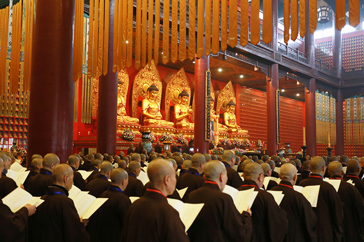 十时许,法会进入到庄严的传供仪式。法师们于万佛楼前排成两列,在声声佛号中,将百味供品传供至长老莲座前。整个法会庄严肃穆,四众弟子祈愿长老不舍众生,早日乘愿再来,普利人天!