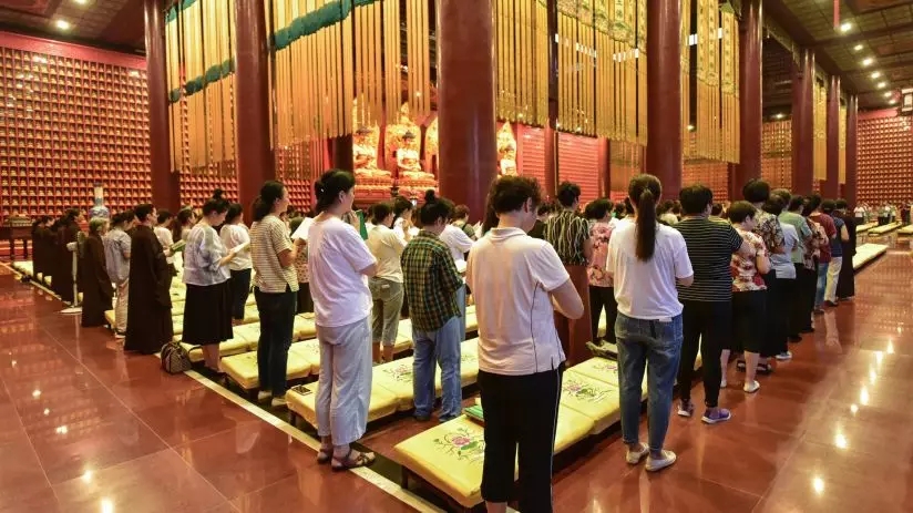 31日中午,本寺西堂常照法师代表柏林禅寺僧团在万佛楼传授三皈五戒,见证了近千位善信正式成为三宝弟子。